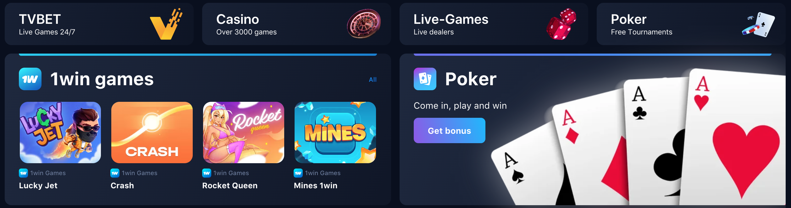 Īpašu popularitāti pēdējā laikā guvušas tā saucamās ātrās jeb "crash" spēles, un 1win piedāvā plašu šāda veida izklaižu klāstu. Populārākās no tām ir Aviator, Lucky Jet un Speed-n-Cash. Šajās spēlēs galvenais uzdevums ir laicīgi izņemt likmi, pirms spēles objekts (piem., lidmašīna vai raķete) pazūd, kamēr reizinātājs pieaug. Šajā sadaļā atradīsiet arī citas ātrās izklaides, piemēram, momentloterijas (nokasāmās kartītes), keno un bingo.